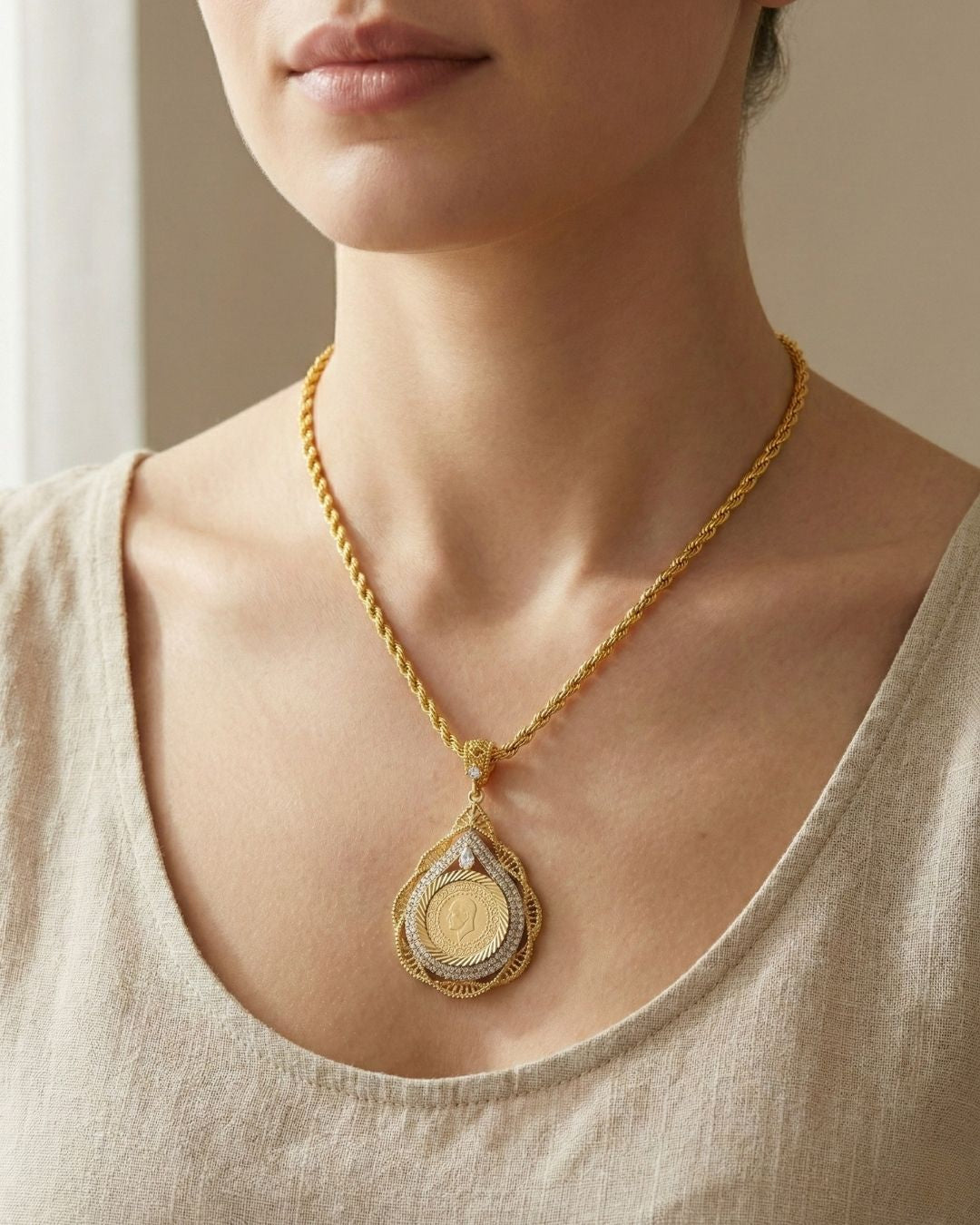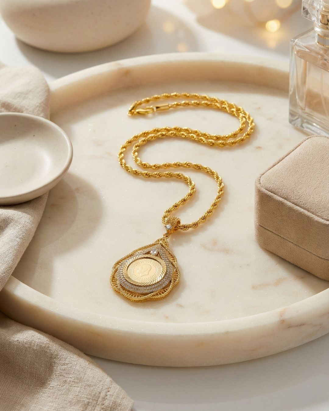 Erhalten Sie mit unserer Tropfen Halskette einen Hauch von Eleganz. Die tropfenförmige Ceyrek Halskette besteht aus 22k vergoldetem Material und verleiht Ihnen einen luxuriösen Look. Perfekt für jeden besonderen Anlass oder um Ihrem Outfit den letzten Schliff zu verleihen.